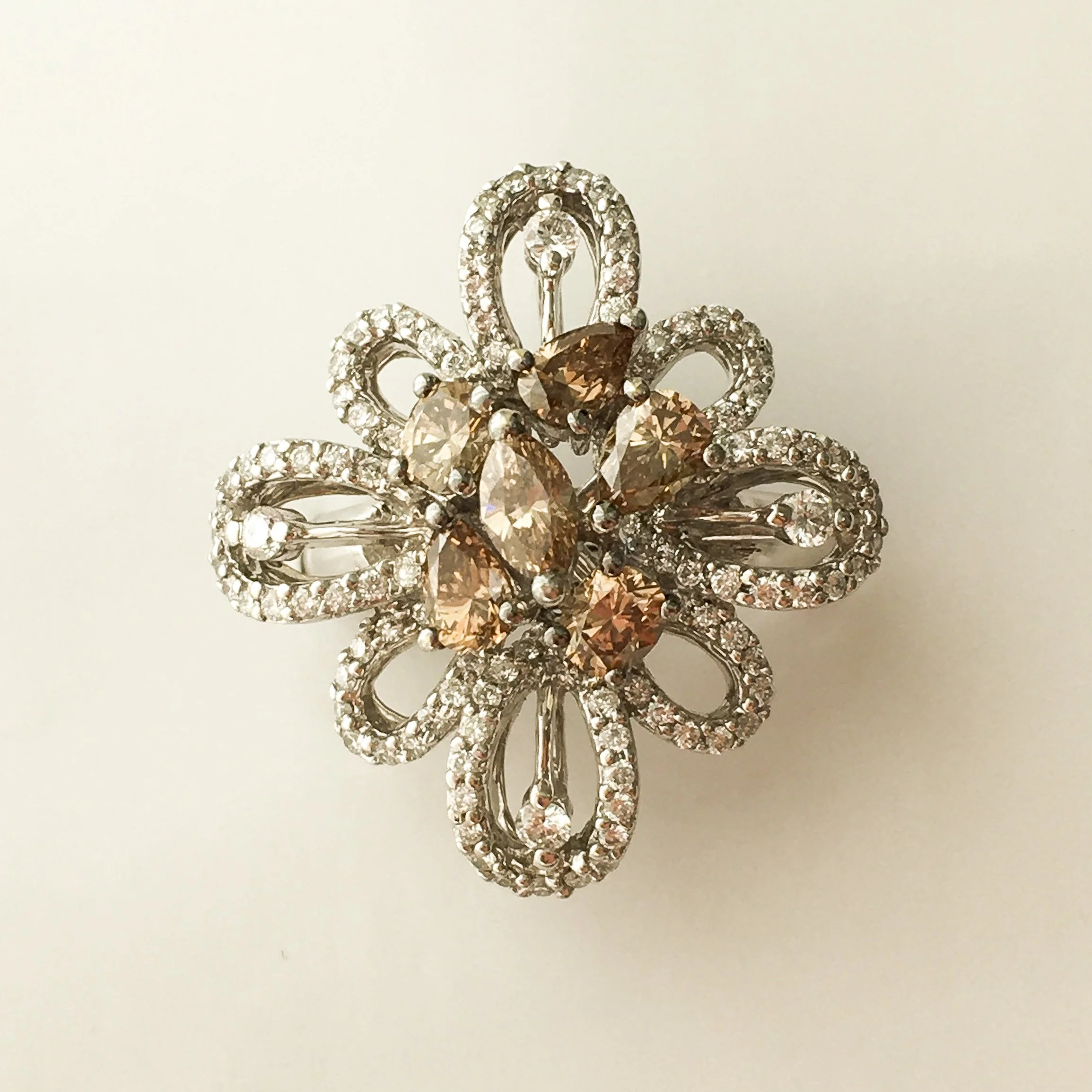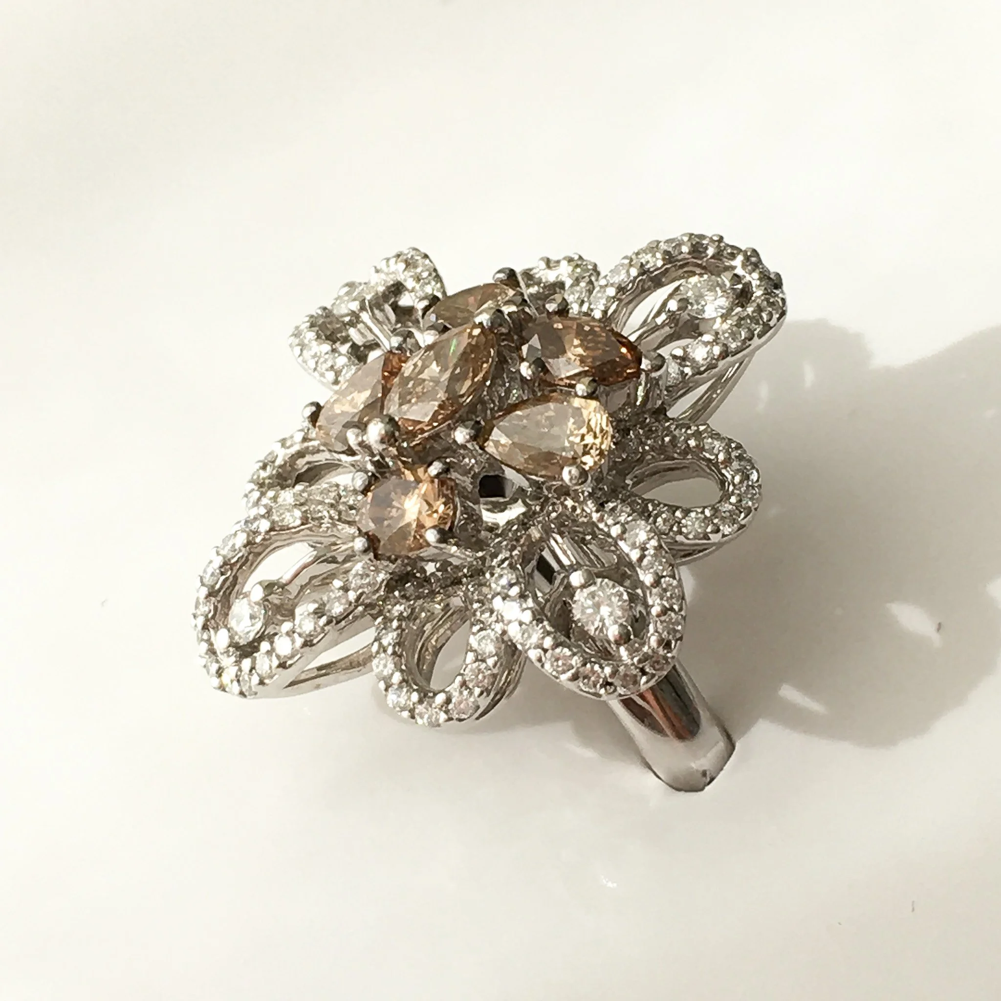 Like a lily in full bloom, this ring glows with the rich warmth of cognac diamonds and the soft brilliance of white diamonds.