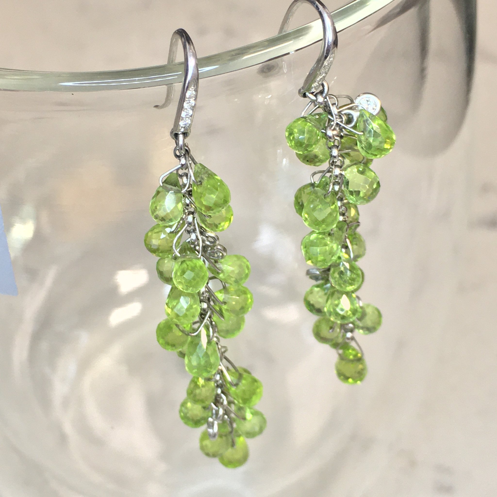 These pair of peridot drop earrings designed to mimic delicate grapes, adding a playful yet refined touch
