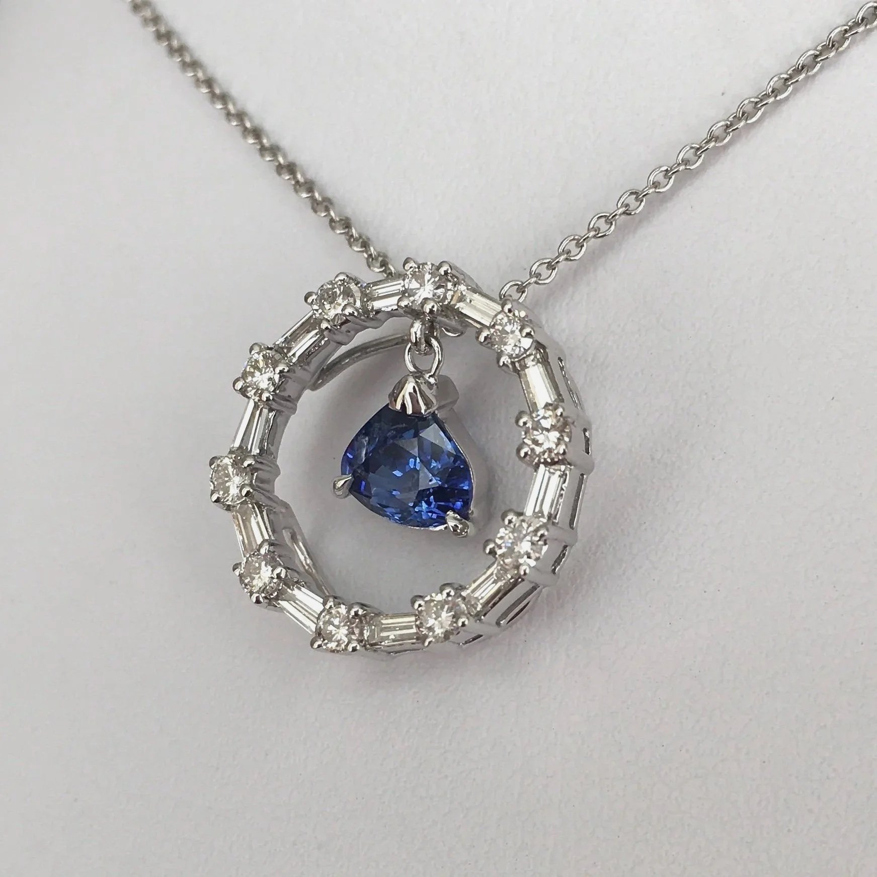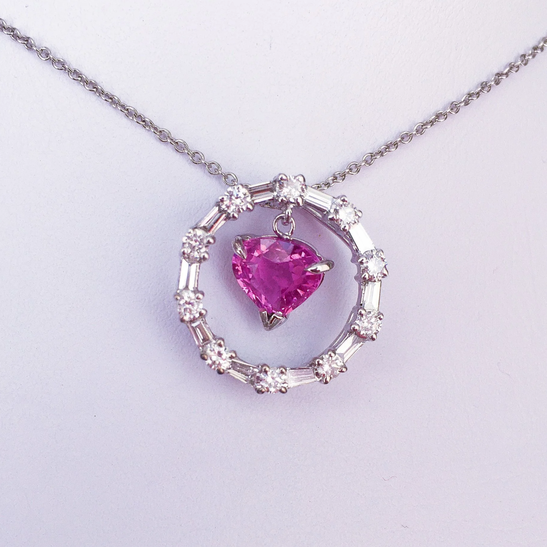 A magnificent triangular pink sapphire gracefully dangles at the heart of the Circle of Life, encircled by brilliant round and baguette diamonds.